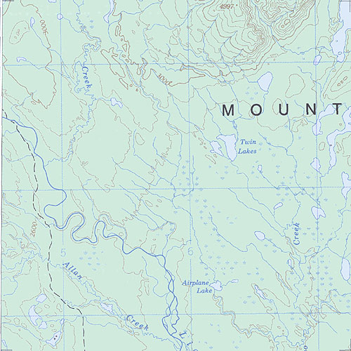 The topo map image to the left is not an exact representation. The image is based on the 1:1,000,000 scale map of the Yukon Territory. The actual 1:250,000 and 1:50,000 scale maps have additional detail not shown at the 1:1,000,000 level.