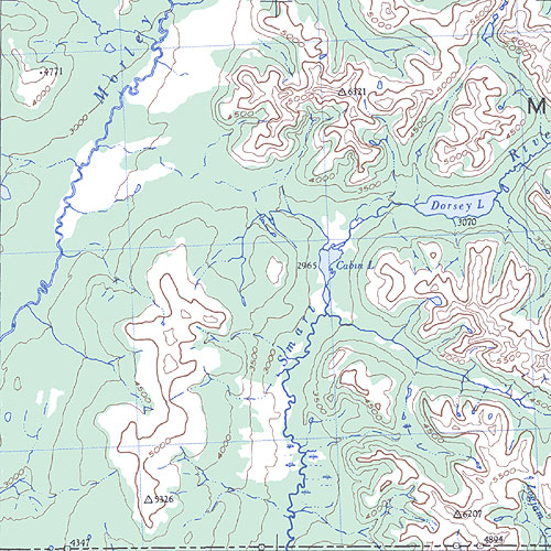 The topo map image to the left is not an exact representation. The image is based on the 1:1,000,000 scale map of the Yukon Territory. The actual 1:250,000 and 1:50,000 scale maps have additional detail not shown at the 1:1,000,000 level.