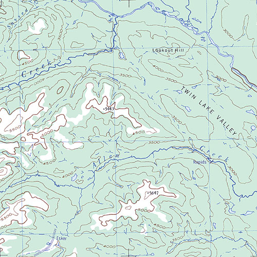 The topo map image to the left is not an exact representation. The image is based on the 1:1,000,000 scale map of the Yukon Territory. The actual 1:250,000 and 1:50,000 scale maps have additional detail not shown at the 1:1,000,000 level.