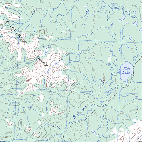 The topo map image to the left is not an exact representation. The image is based on the 1:1,000,000 scale map of the Yukon Territory. The actual 1:250,000 and 1:50,000 scale maps have additional detail not shown at the 1:1,000,000 level.
