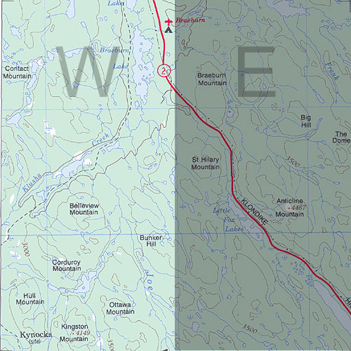 | The topo map image to the left is not an exact representation. The image is based on the 1:1,000,000 scale map of the Yukon Territory. The actual 1:250,000 and 1:50,000 scale maps have additional detail not shown at the 1:1,000,000 level. |
