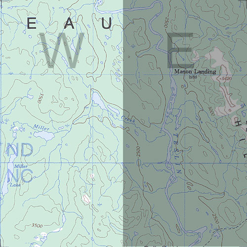 | The topo map image to the left is not an exact representation. The image is based on the 1:1,000,000 scale map of the Yukon Territory. The actual 1:250,000 and 1:50,000 scale maps have additional detail not shown at the 1:1,000,000 level. |