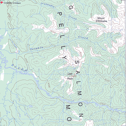 The topo map image to the left is not an exact representation. The image is based on the 1:1,000,000 scale map of the Yukon Territory. The actual 1:250,000 and 1:50,000 scale maps have additional detail not shown at the 1:1,000,000 level.