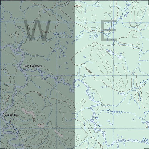 | The topo map image to the left is not an exact representation. The image is based on the 1:1,000,000 scale map of the Yukon Territory. The actual 1:250,000 and 1:50,000 scale maps have additional detail not shown at the 1:1,000,000 level. |