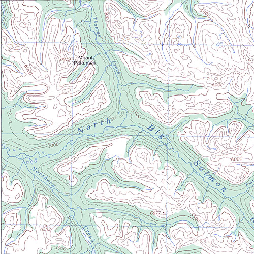 The topo map image to the left is not an exact representation. The image is based on the 1:1,000,000 scale map of the Yukon Territory. The actual 1:250,000 and 1:50,000 scale maps have additional detail not shown at the 1:1,000,000 level.