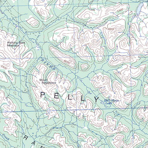 The topo map image to the left is not an exact representation. The image is based on the 1:1,000,000 scale map of the Yukon Territory. The actual 1:250,000 and 1:50,000 scale maps have additional detail not shown at the 1:1,000,000 level.