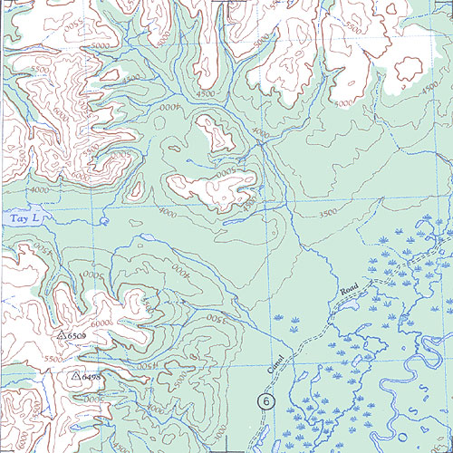 The topo map image to the left is not an exact representation. The image is based on the 1:1,000,000 scale map of the Yukon Territory. The actual 1:250,000 and 1:50,000 scale maps have additional detail not shown at the 1:1,000,000 level.