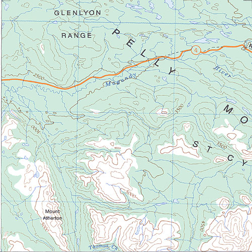 The topo map image to the left is not an exact representation. The image is based on the 1:1,000,000 scale map of the Yukon Territory. The actual 1:250,000 and 1:50,000 scale maps have additional detail not shown at the 1:1,000,000 level.