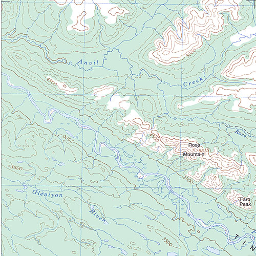 The topo map image to the left is not an exact representation. The image is based on the 1:1,000,000 scale map of the Yukon Territory. The actual 1:250,000 and 1:50,000 scale maps have additional detail not shown at the 1:1,000,000 level.