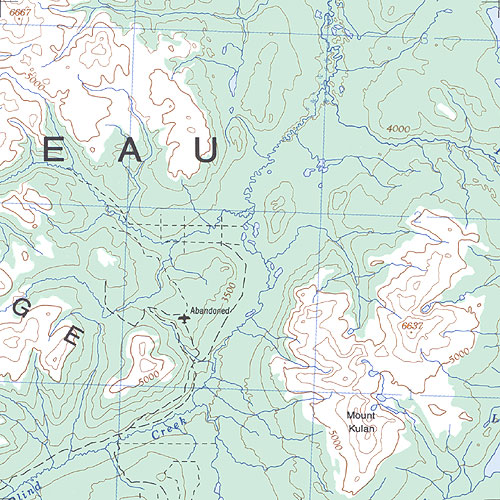 The topo map image to the left is not an exact representation. The image is based on the 1:1,000,000 scale map of the Yukon Territory. The actual 1:250,000 and 1:50,000 scale maps have additional detail not shown at the 1:1,000,000 level.
