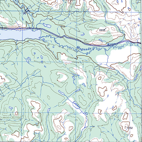 The topo map image to the left is not an exact representation. The image is based on the 1:1,000,000 scale map of the Yukon Territory. The actual 1:250,000 and 1:50,000 scale maps have additional detail not shown at the 1:1,000,000 level.