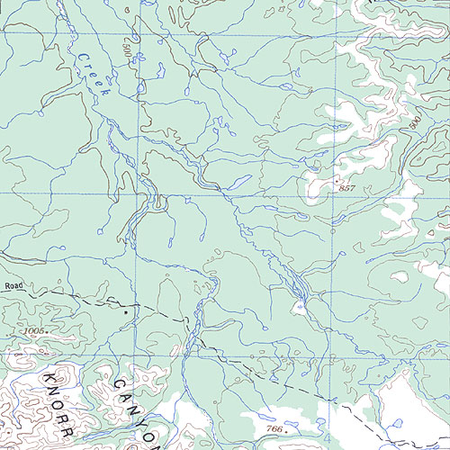 The topo map image to the left is not an exact representation. The image is based on the 1:1,000,000 scale map of the Yukon Territory. The actual 1:250,000 and 1:50,000 scale maps have additional detail not shown at the 1:1,000,000 level.