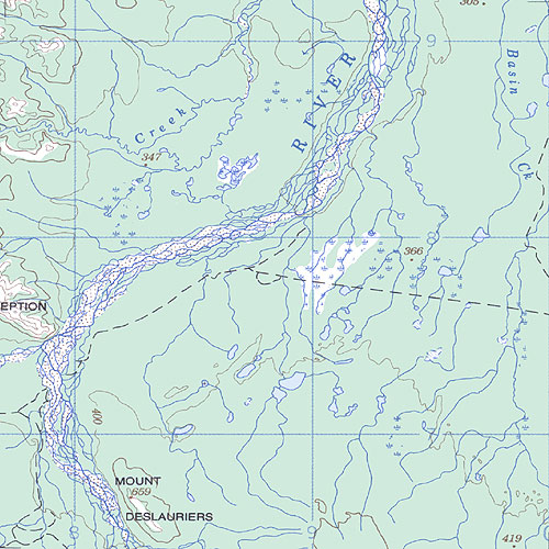 The topo map image to the left is not an exact representation. The image is based on the 1:1,000,000 scale map of the Yukon Territory. The actual 1:250,000 and 1:50,000 scale maps have additional detail not shown at the 1:1,000,000 level.