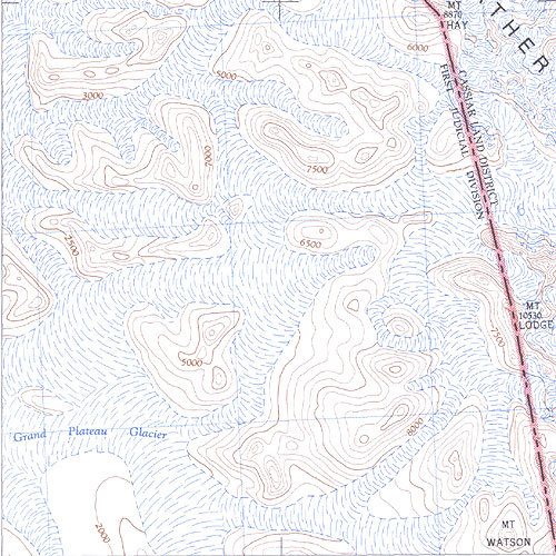 | The topo map image to the left is not an exact representation. The image is based on the 1:1,000,000 scale map of the Yukon Territory. The actual 1:250,000 and 1:50,000 scale maps have additional detail not shown at the 1:1,000,000 level. |