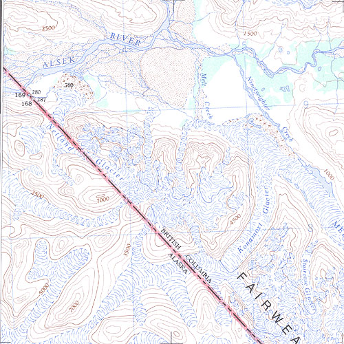 The topo map image to the left is not an exact representation. The image is based on the 1:1,000,000 scale map of the Yukon Territory. The actual 1:250,000 and 1:50,000 scale maps have additional detail not shown at the 1:1,000,000 level.