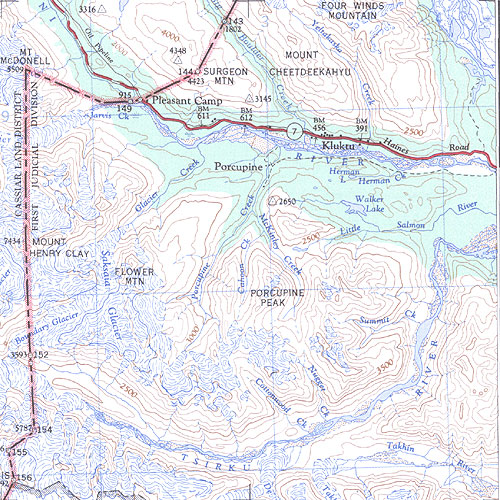 The topo map image to the left is not an exact representation. The image is based on the 1:1,000,000 scale map of the Yukon Territory. The actual 1:250,000 and 1:50,000 scale maps have additional detail not shown at the 1:1,000,000 level.