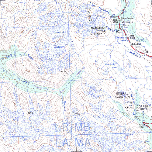 The topo map image to the left is not an exact representation. The image is based on the 1:1,000,000 scale map of the Yukon Territory. The actual 1:250,000 and 1:50,000 scale maps have additional detail not shown at the 1:1,000,000 level.