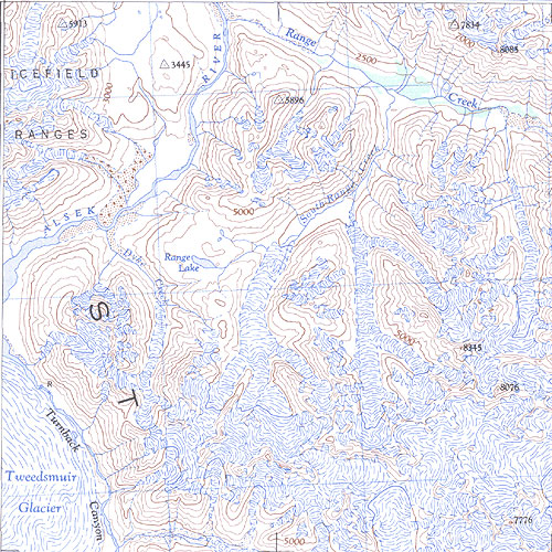The topo map image to the left is not an exact representation. The image is based on the 1:1,000,000 scale map of the Yukon Territory. The actual 1:250,000 and 1:50,000 scale maps have additional detail not shown at the 1:1,000,000 level.