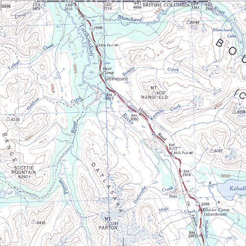 The topo map image to the left is not an exact representation. The image is based on the 1:1,000,000 scale map of the Yukon Territory. The actual 1:250,000 and 1:50,000 scale maps have additional detail not shown at the 1:1,000,000 level.