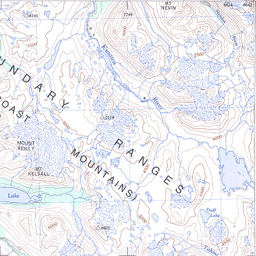 The topo map image to the left is not an exact representation. The image is based on the 1:1,000,000 scale map of the Yukon Territory. The actual 1:250,000 and 1:50,000 scale maps have additional detail not shown at the 1:1,000,000 level.