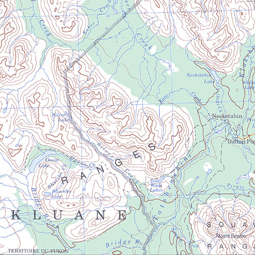 The topo map image to the left is not an exact representation. The image is based on the 1:1,000,000 scale map of the Yukon Territory. The actual 1:250,000 and 1:50,000 scale maps have additional detail not shown at the 1:1,000,000 level.