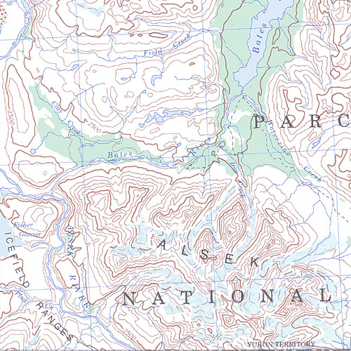 The topo map image to the left is not an exact representation. The image is based on the 1:1,000,000 scale map of the Yukon Territory. The actual 1:250,000 and 1:50,000 scale maps have additional detail not shown at the 1:1,000,000 level.