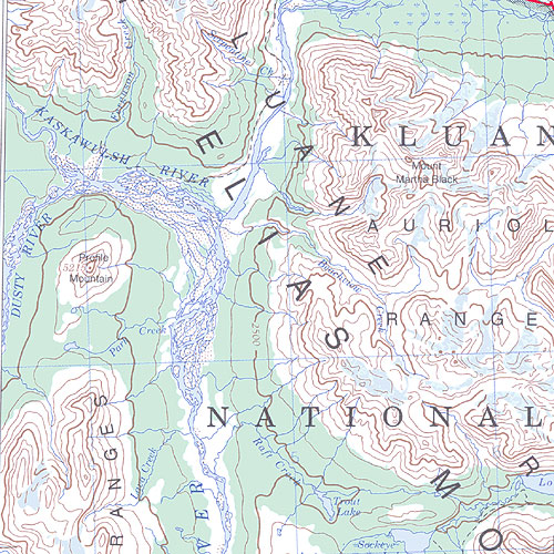 The topo map image to the left is not an exact representation. The image is based on the 1:1,000,000 scale map of the Yukon Territory. The actual 1:250,000 and 1:50,000 scale maps have additional detail not shown at the 1:1,000,000 level.