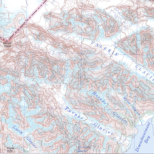| The topo map image to the left is not an exact representation. The image is based on the 1:1,000,000 scale map of the Yukon Territory. The actual 1:250,000 and 1:50,000 scale maps have additional detail not shown at the 1:1,000,000 level. |