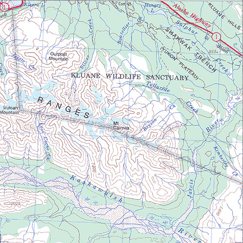 The topo map image to the left is not an exact representation. The image is based on the 1:1,000,000 scale map of the Yukon Territory. The actual 1:250,000 and 1:50,000 scale maps have additional detail not shown at the 1:1,000,000 level.