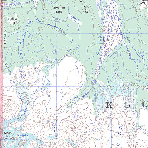 The topo map image to the left is not an exact representation. The image is based on the 1:1,000,000 scale map of the Yukon Territory. The actual 1:250,000 and 1:50,000 scale maps have additional detail not shown at the 1:1,000,000 level.