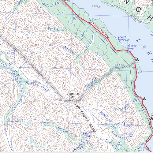 The topo map image to the left is not an exact representation. The image is based on the 1:1,000,000 scale map of the Yukon Territory. The actual 1:250,000 and 1:50,000 scale maps have additional detail not shown at the 1:1,000,000 level.