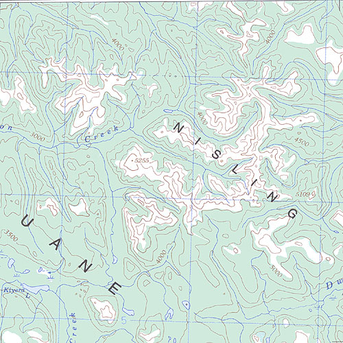 The topo map image to the left is not an exact representation. The image is based on the 1:1,000,000 scale map of the Yukon Territory. The actual 1:250,000 and 1:50,000 scale maps have additional detail not shown at the 1:1,000,000 level.