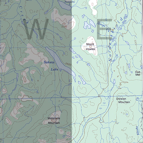 | The topo map image to the left is not an exact representation. The image is based on the 1:1,000,000 scale map of the Yukon Territory. The actual 1:250,000 and 1:50,000 scale maps have additional detail not shown at the 1:1,000,000 level. |