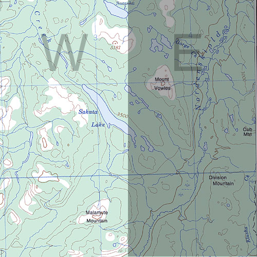 | The topo map image to the left is not an exact representation. The image is based on the 1:1,000,000 scale map of the Yukon Territory. The actual 1:250,000 and 1:50,000 scale maps have additional detail not shown at the 1:1,000,000 level. |