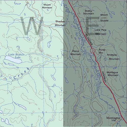 | The topo map image to the left is not an exact representation. The image is based on the 1:1,000,000 scale map of the Yukon Territory. The actual 1:250,000 and 1:50,000 scale maps have additional detail not shown at the 1:1,000,000 level. |