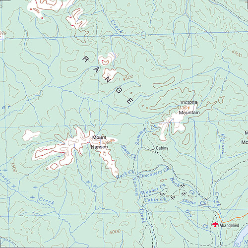 | The topo map image to the left is not an exact representation. The image is based on the 1:1,000,000 scale map of the Yukon Territory. The actual 1:250,000 and 1:50,000 scale maps have additional detail not shown at the 1:1,000,000 level. |
