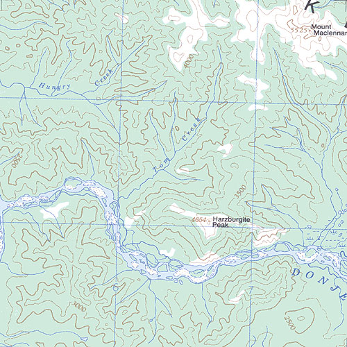 | The topo map image to the left is not an exact representation. The image is based on the 1:1,000,000 scale map of the Yukon Territory. The actual 1:250,000 and 1:50,000 scale maps have additional detail not shown at the 1:1,000,000 level. |