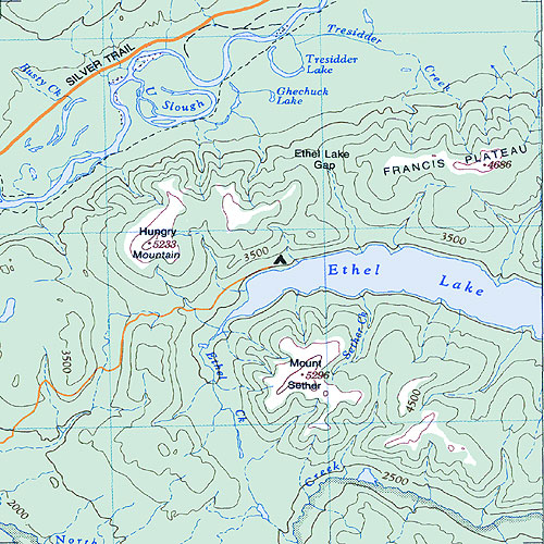 The topo map image to the left is not an exact representation. The image is based on the 1:1,000,000 scale map of the Yukon Territory. The actual 1:250,000 and 1:50,000 scale maps have additional detail not shown at the 1:1,000,000 level.