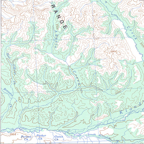 The topo map image to the left is not an exact representation. The image is based on the 1:1,000,000 scale map of the Yukon Territory. The actual 1:250,000 and 1:50,000 scale maps have additional detail not shown at the 1:1,000,000 level.