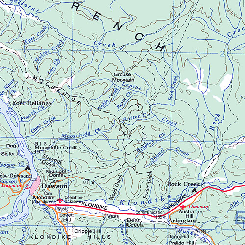 The topo map image to the left is not an exact representation. The image is based on the 1:1,000,000 scale map of the Yukon Territory. The actual 1:250,000 and 1:50,000 scale maps have additional detail not shown at the 1:1,000,000 level.