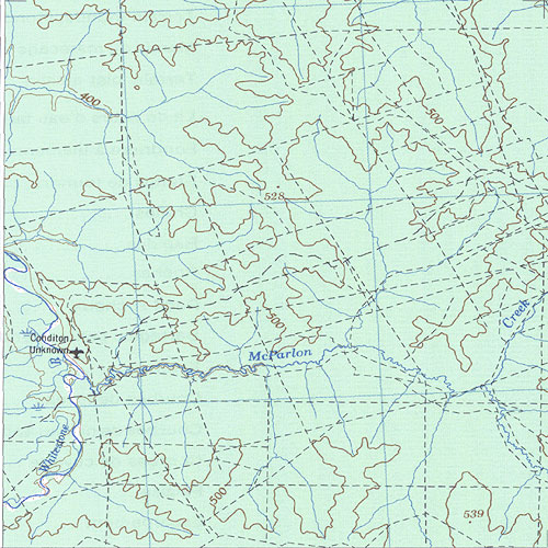 The topo map image to the left is not an exact representation. The image is based on the 1:1,000,000 scale map of the Yukon Territory. The actual 1:250,000 and 1:50,000 scale maps have additional detail not shown at the 1:1,000,000 level.
