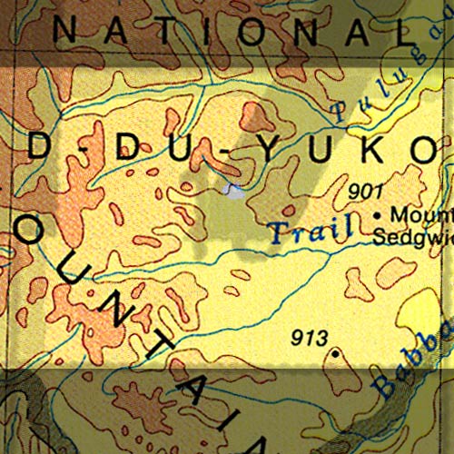 The topo map image to the left is not an exact representation. The image is based on the 1:1,000,000 scale map of the Yukon Territory. The actual 1:250,000 and 1:50,000 scale maps have additional detail not shown at the 1:1,000,000 level.