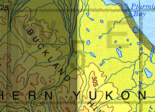 | The topo map image to the left is not an exact representation. The image is based on the 1:1,000,000 scale map of the Yukon Territory. The actual 1:250,000 and 1:50,000 scale maps have additional detail not shown at the 1:1,000,000 level. |