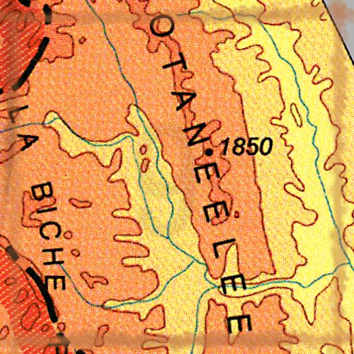 The topo map image to the left is not an exact representation. The image is based on the 1:1,000,000 scale map of the Yukon Territory. The actual 1:250,000 and 1:50,000 scale maps have additional detail not shown at the 1:1,000,000 level.