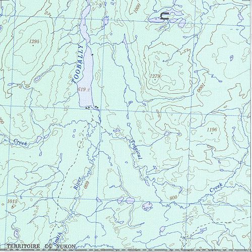 The topo map image to the left is not an exact representation. The image is based on the 1:1,000,000 scale map of the Yukon Territory. The actual 1:250,000 and 1:50,000 scale maps have additional detail not shown at the 1:1,000,000 level.