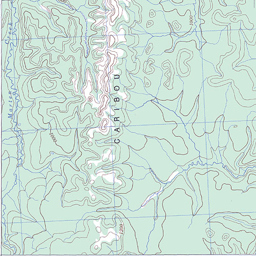 | The topo map image to the left is not an exact representation. The image is based on the 1:1,000,000 scale map of the Yukon Territory. The actual 1:250,000 and 1:50,000 scale maps have additional detail not shown at the 1:1,000,000 level. |